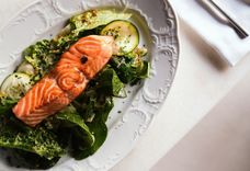 210 г • Зелёный салат из шпината и салата романо со свежими огурцом о цукини, заправленные азиатской заправкой на основе зернистой горчицы, оливкового и кунжутного масел и устричного соуса. Подаётся со стейком из лосося прожарки медиум по умолчанию.