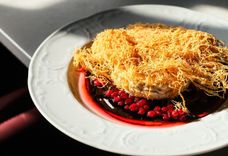 200 г • Обжаренный в тесте катаифи бри. Подаётся с мочёной в сиропе брусникой и глазурью из квасного сусла и бальзамического уксуса.