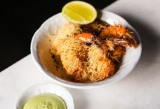 190 г • Креветки обёрнутые в тесто катаифи и обжаренные во фритюре. Подаются с васаби майо