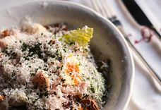 220 г • Паста с копчёным беконом, пармезаном, желтком и чёрным перцем.