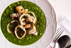 350 г • Ризотто, приготовленный с пюре из свежего шпината. Подаётся с обжаренными креветками, гребешком и кальмаром а’ля меньер.