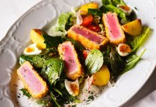 230 г • Классический салат нисуаз из листьев салата, молодого картофеля, томатов черри, перепелиных яиц и стейка из тунца, заправленные цитрусовым винегретом.