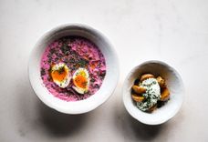 450 г • Холодик на кефире с печёной свёклой, свежими овощами и индейкой су-вид. Подаётся с молодым картофелем и сметаной.