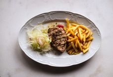390 г • Стейк из тунца приготовленный на теппане. Подаётся с картофелем фри, миксом из свежего салата, заправленного цитрусовым винегретом и соусом меньер.