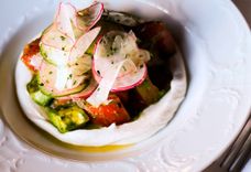 230 г • Розовые томаты с авокадо, заправленные цитрусовым винегретом. Подается на подушке из взбитой феты с шапкой из микс-салата