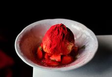 150 г • Освежающий десерт из фруктово-ягодного пюре, подаётся с дольками клубники