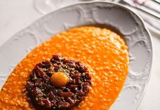 320 г • Ризотто, приготовленный с добавлением томатного. Подаётся с тартаром из говядины, заправленным корнишоном, каперсами, оливками, вялеными томатами, двумя видами горчицы и желтком.
