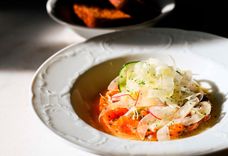 260 г • Хумус, нут для которого мы чистим вручную, подаётся с лососем, креветкой, кальмаром и тунцом, трюфельным тосазу. Подается с салатом из фенхеля, салата айсберг, свежего огурца и редиса